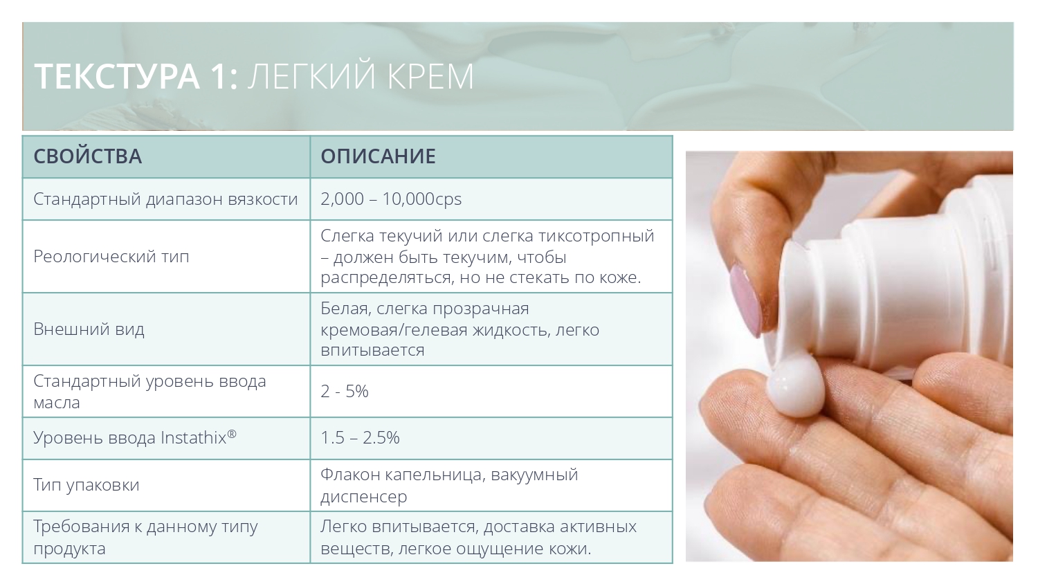 • Сатиновый матовый внешний вид, имитирующий ощущение силиконового эластомера – может заменить синтетические эмульгаторы / полимеры